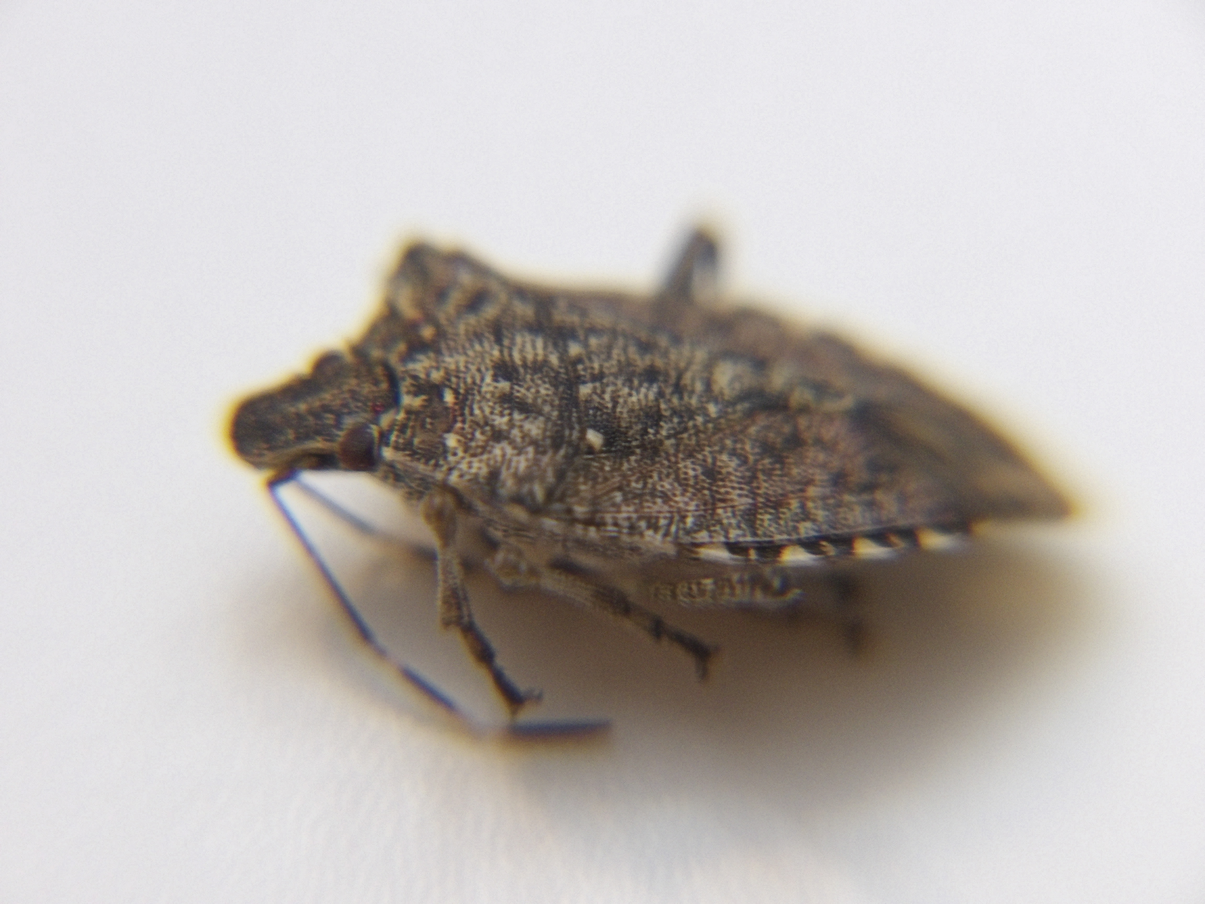 There has been a home invader trying to keep warm! A harmless Brown Marmorated Stink Bug! The name sounds horrible in itself though. It was on a wall. I captured it. I put it into a zip log bag next to The Science Jar (tm) and then when the mood struck, I put that little critter on a slide rightside up and downside up and photographed away and back into the super-scientific zip-lock bag went the stinky (I really didn't smell it, but it's in the name so I'll take the taxonomist's word for it that it stinks) little critter! Hope you enjoy the up close and personal photos with the harmless little stink bug. |